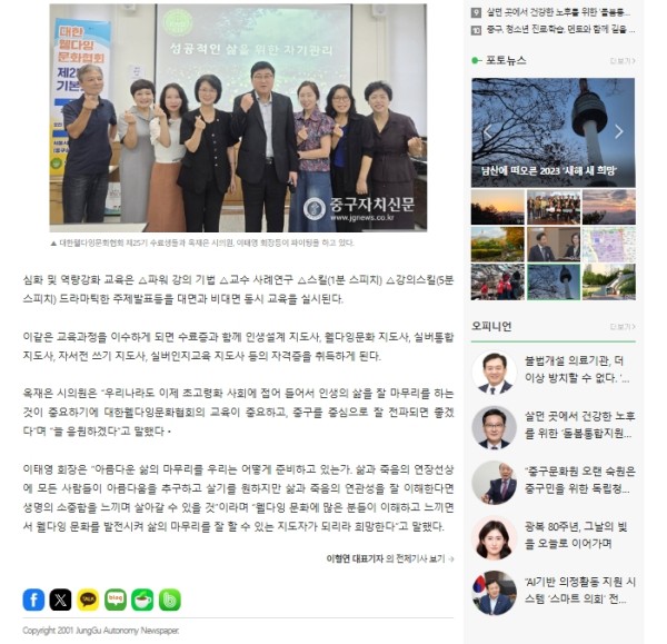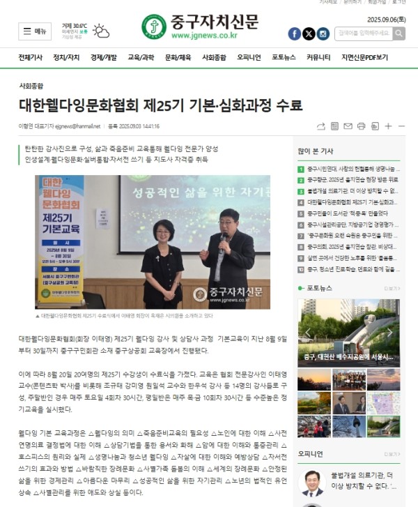 중구자치신문<25기 기본·심화과정 수료식> 페이지 정보 작성자 최고관리자 댓글 0건 조회 70회 작성일 25-09-06 13:09 목록 본문 . 관련링크 http://www.jgnews.co.kr/news/article.html?no=30167 8회 연결 다음글중구자치신문<21기 수강생 모집> 25.02.17 댓글 0 댓글목록 등록된 댓글이 없습니다.